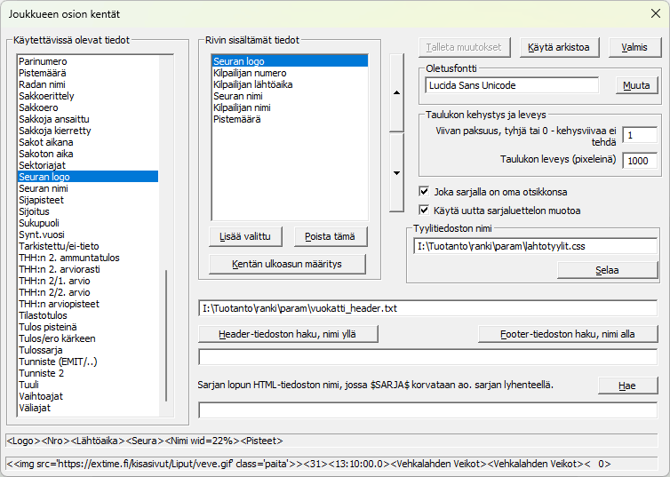 Tässä sitten tarkempaa selostusta. Kuvassa oikealla näkyy, että nyt on valittu osiossa Logojen, lippukuvien URL ja kuvatiedostojen format vaihtoehto . Ensimmäisellä kertaa pitää antaa lisäksi linkkitiedoston nimi. Napilla voidaan tiedoston nimi hakea nopeasti. Esimerkissä käytän pyöräilyunionin nettisivuilla olevia seurojen ajoasujen kuvien linkkejä, joista olen tehnyt Excelillä/OpenOfficella tiedoston SuomenPU.csv. Siinä on kaksi kenttää seuraa kohti, alussa seuran nimilyhenne ja toisena kenttänä sitten suoraan linkki kuvaan, jossa ajoasun kuva on. Alla pieni pala ko. tiedostosta, selitys alempana. JurVo;<img src='https://pyoraily.fi/wp-content/uploads/jurvo-300x300.jpg' class='paita'> KoiI;<img src='https://pyoraily.fi/wp-content/uploads/koii-paita-300x289.jpg' class='paita'> KoPy;<img src='https://pyoraily.fi/wp-content/uploads/kopy-paita-300x189.jpg' class='paita'> YJ;<img src='https://extime.fi/kisasivut/Liput/YJ.jpg' class='paita'> JurVo on siis Jurvan Voiman seuralyhenne. Seuran ajoasun kuva on pyoraily.fi sivustolla tietyssä kansiossa nimellä jurvo-300x300.jpg. Kuvanimen perään lisäsin kuvalle css-luokan paita ja css-tiedostossa annan sitten kuvalle tarkan koon ja muita määrittelyitä. Tuo luokan 'paita' määrittely on käyttämässäni tyylitiedostossa nyt