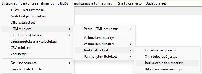 Tämä kaikki määritetään tutulla tavalla. Uutta on vain ja menujen joukkueita koskeviin alimenuihin tulleet kaksi riviä. joukkueen tietojen antamiseen ja urheilijan riville laitettavien tietojen antamiseen.