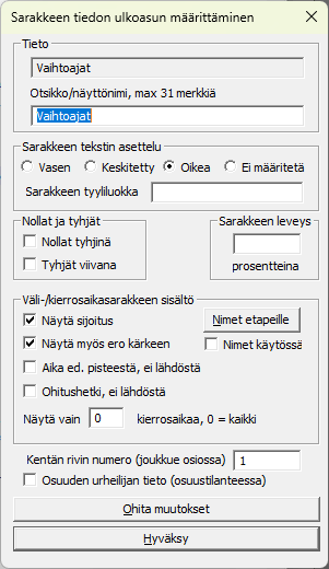 , sen ruuduissa Rivi ja Sarake Samalla rivillä olevat tiedot tulostetaan annetussa sarakejärjestyksessä. Ja aina pitää muistaa, että sarakenumerot ovat välillä 1 - 16 ja tietyt kaksi saraketta (Vaihtoajat ja Sakkoja ansaittu), jos ovat mukana joukkueosiossa, toistuvat joka rivillä alekkain aina samalla sarakkeella. |