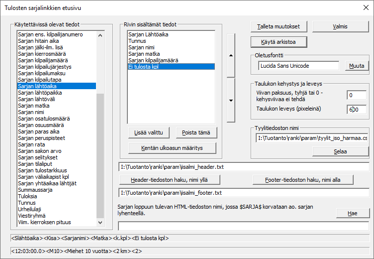 Isoissa kilpailuissa seurantaan valitaan todennäköisesti yksi sarja kerrallaan, ja seuranta pyörii korkeintaan kahdessa tiedostossa kerrallaan, edellisen loppupäätä ja seuraavan alkupäätä. Mutta jos tekemäni ratkaisu herättää kehittämisajatuksia, niin kertokaa niistä Facebookin ExTime-ryhmässä. Tiedostojen nimeämiseen voidaan vaikuttaa myös tiedoston nimeen sijoitettavalla merkkijonolla (maskilla) $SARJA$, joka korvaantuu aina tulostettavan sarjan tunnuksella. Jos tiedostoon menee useita sarjoja, tiedosto nimetään ensimmäisen sarjan mukaan.
