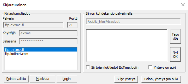 Napilla ExTime avaa yhteyden ulkopuoliseen verkkoon (saatat saada palomuurin varoituksen asiasta) ja jos kirjautumistiedot olivat oikein, asettaa oletuskansioksi annetun kansion. Jos kansiota ei löydy tai haluat vaihtaa sitä, valitse kansion alapuolella olevasta listasta sopiva. tarkoittaa siirtymistä kansiopolussa ylemmälle tasolle, kuten esimerkkikuvassa olen tehnyt. Nappi tallettaa näytön tiedot ini-tiedostoon ja sulkee ikkunan. Saman tekee , mutta se ei päivitä ini-tiedostoa. Nappi avaa tietokentät muuttamista varten. Näin saat luoduksi uuden palvelinyhteyden. Nappi poistaa valitun yhteyden käytöstä ja siis myös extime.ini-tiedostosta. Jokainen siirto on sitten oma yksittäinen kokonaisuutensa. ExTime kirjautuu annetuilla tiedoilla palvelimelle, kopioi tiedoston ja lopettaa yhteyden. |