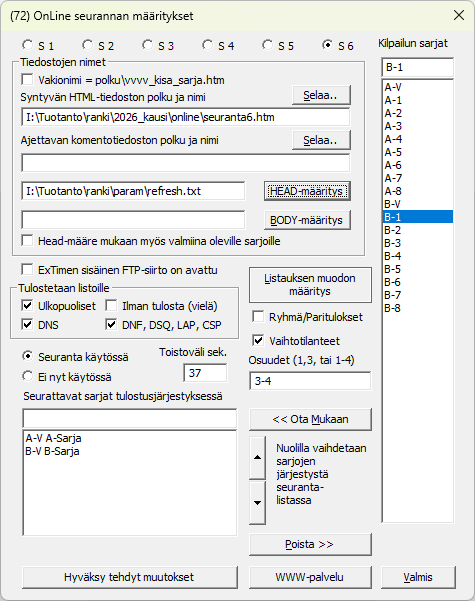 Oikeassa reunassa näkyvät kilpailun sarjat, niistä yksi kerrallaan valitsemalla ja napilla saadaan sarja mukaan seurantaan, vastaavasti seurattavien sarjojen listalta valitsemalla yksi ja painamalla -nappia se sarja poistuu seurannasta. Sarjojen keskinäistä järjestystä vaihdetaan , valittua sarjaa ylöspäin tai alaspäin siirtämällä. Ja ylimmän sarjan tunnus vaikuttaa siis syntyvän tiedoston nimeen, jos $SARJA$ maski on nimessä käytössä. Uhraa pieni hetki sen miettimiseen, minkä sarjan satunnainen selailija haluaisi nähdä ensiksi. Ja jos samaan seurantaan on tarkoitus laittaa monta eri sarjaa, kannattaako kaikki sarjat laittaa heti kilpailun alussa, vaiko vasta kisan kuluessa lisäillä seuraavia sarjoja seurantaan ja siihen ylimmäksi? ruudun avulla annetaan se aikaväli, kuinka usein html-tiedosto tehdään. Kaukana netissä oleva selailija arvostaa toimivaa tulostusta enemmän kuin epavakaata, viiden sekunnin välein tapahtuvaa päivityksen yritystä. Siis harvempi päivitysväli on luotettavampi. Uusi tiedosto kirjoitetaan ensin tilapäisnimellä ja valmis kopioidaan aina entisen päälle. Viesteissä, esimerkki oikealla, saadaan vaihtotilanne näkyviin, kun kohtaan laitetaan rasti ja siihen alapuoliseen ruutuun niiden osuuksien numerot, jotka halutaan mukaan. Listauksen malli näkyy Vaihtojen tilanteet (linkissä Keski-Pohjanmaan maakuntaviestin tilanne osuuden 6 lopussa). Osuusnumerot voidaan antaa yksittäin, malliin 1,2,3,4 tai välinä malliin 3-4 tai jopa näiden yhdistelmänä (1,5-7), kuten windowsin printtaa-ikkunassa määritetään printattavat sivut. Käyttäjän tulee itse huolehtia siitä, että tulostetaan vain viestisarjoista, osuuksien sarjoista ei vaihtotilannetta saada, niistä pitää ottaa normaalit osuusajat kuten tehdään henkilökohtaisissa sarjoissa. Osuuksien sarjoja ja viestisarjoja ei saa myöskään yhdistää samaan seurantaan. |