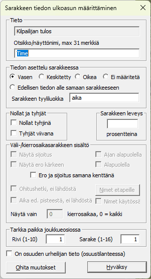 Kenttämäärityksissä annetaan sarakkeelle nimi, ehdotuksena on ExTimen käyttämä tiedon nimitys tarpeeton 'Kilpailijan' tai 'Sarjan' lisäosa poistettuna. Jos lisäät tyhjän sarakkeen (tietona X, tyhjä sarake) niin muista vaihtaa oksikkoon vähintään yksi tyhjä merkki. Jos otsikko on tässä ihan tyhjä, niin otsikkosarakkeelle tulee tuo X, tyhjä sarake. Tieto voidaan sarakkeella sijoittaa joko vasempaan tai oikeaan reunaan tai sijoittaa sarakkeen keskelle. Ja uutta versiosta 10.4.2 alkaen on se, että kentälle voidaan antaa ihan oma tyyliluokkansa (CSS:n class-määre). Kirjoittamalla annetun luokan määritys käytettyyn tyylitiedostoon (*.css), saadaan ihan uutta ilmettä nettisivuille. Jos tyyliluokka annetaan, ei vasen/oikea/keskitetty-sijoittelua tarvita, eikä %-leveyksien määrittelyjä. Tuossa alla on malli, kun tein seuraavat määreet css-tiedostoon: