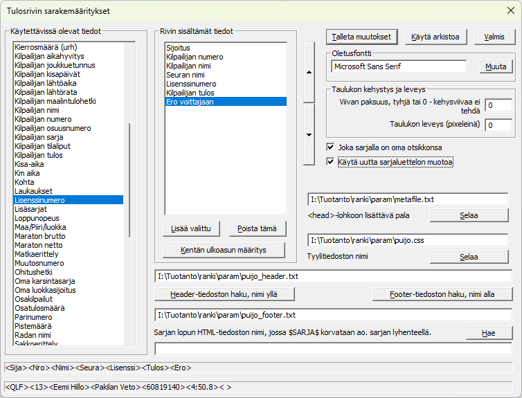 -nappi avaa uuden ikkunan, jonka avulla rakennetaan HTML-tulostuksen Layout. Sama ikkuna avautuu myös valikon kohdasta HTML-tiedoston rakenteesta on enemmän tarinaa tämän linkin osoittamassa paikassa. Livetuloslistan alussa näkyy selitysteksti Valmis tai Välituloste, puuttuvien tulosten määrä ja myös kelloaika, milloin tuloste on tehty. Tästä näkyy eräs malli. (Kemin tulokset Iisalmen määrittelyillä). Muistutus tähän väliin. ExTimen käyttämät vakiosanat (esim Valmis tai Välituloste) voi helposti korvata omilla sanoilla. Tarvetta voisi olla vaikka tehdä täysin ruotsin- tai vironkieliset tulokset. Sarakkeiden nimet annetaan tuossa heti alempana kerrotulla tavalla ja tuo vakiotekstien korvaaminen onnistuu -valikon välilehdellä . Siitä löytyy tarkemmat ohjeet listamalli.htm ohjeesta. Tässä Tulosrivin sarakemääritykset-ikkunassa valitaan listaan tulevat tiedot, niiden järjestys, mahdollisesti leveys ja myös koko tulostuksen oletusfontti, leveys ja kehyksen viivan paksuus. Jos listauksen Header-tiedostossa on annettu taulukolle jokin tietty leveys, voidaan myös urheilijataulukolle antaa se sama leveys. Kentän sijoitus vasen/oikealaitaisesti tai keskelle, samoin kuin puuttuvan arvon näkyminen joko nollana tai viivana valitaan napilla . Kentän nimen tuplaklikkaus on oikotie. Tarkemmat ohjeet ovat täällä. Väliajoista voidaan määritellä myös, onko laskettu aika kilpailun alusta vai vasta edellisestä väliaikapisteestä laskettu aika, tämän lisäsin erityisesti triathlonin toivomuksesta (kuka oli pyöräilyn nopein). Valinnaisia lisäsarakkeita ovat sijoitus väliajan mukaan ja ero kärkeen. Kierrosajoista voidaan ottaa mukaan vain xx viimeistä kierrosaikaa. Väliaikoja tulostetaan niin monta, kuin kyseiseen sarjaan on virallisia väliaikapaikkoja määritetty. Jos sijoitusta ei ole, kilpailija on vielä matkalla. Poisjääneet ja keskeyttäneet näkyvät FIS:n mukaisella koodituksella. (DNS = Did Not Start, jne) |