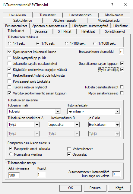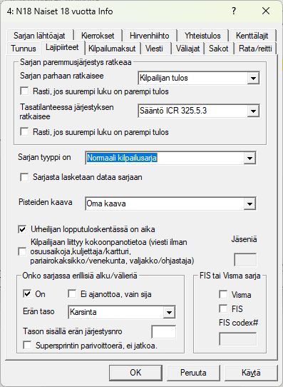 Määrittelyjen alaosassa voidaan väliaikatietoja säätää tarkemmin ja ilmoittaa, kuinka monta kierrosaikaa enintään näytetään. Tietysti aina xx viimeisintä, jos xx:ää ei anneta, niin kaikki 24 kierrosaikaa 10 km juoksukisassa näkyvät.