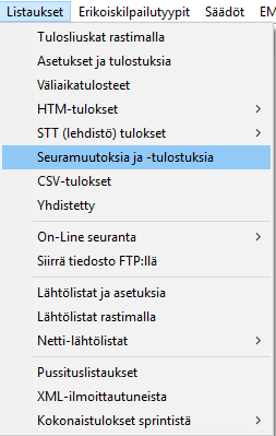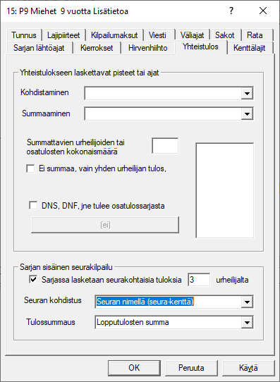 -valikon välilehdellä rastitaan oikealla keskellä olevista ruuduista ainakin ruutu . Ja jos yhteenvedossa halutaan nähdä, keistä urheilijoista tulos koostuu, rastitaan myös kohta . Ylhäällä vasemmalla rastitaan , jos tarpeen. Sekä harkitaan käytettävä ajan tulostustarkkuus ja muutkin asetukset. Sarjakohtaisesti laitetaan Sarjan tietojen -välilehdellä täppä kohtaan . Lisäksi määritetään onko joukkueen koon oltava tietty (0=ei rajoitusta) ja miten yhteistulos kohdistetaan seuralle/piirille ja mitä summataan, aikaa vai pisteitä. -välilehdellä sitten ilmoitetaan käytettävä kaava. Alla on sitten erilaisia esimerkkejä siitä, miten eri tavalla voidaan seurakisan tuloksia laskea. Valitkaa mieleisenne. Otsikko Seuratilanne käännetään ruotsiksi (tai vaihdetaan Piiritilanne-sanaksi) / ikkunan välilehdellä vaihtamalla -lohkossa sana Seuratilanne (=STILANN) sanaksi Samma på svenska tai Piirien kisa sanaksi. |